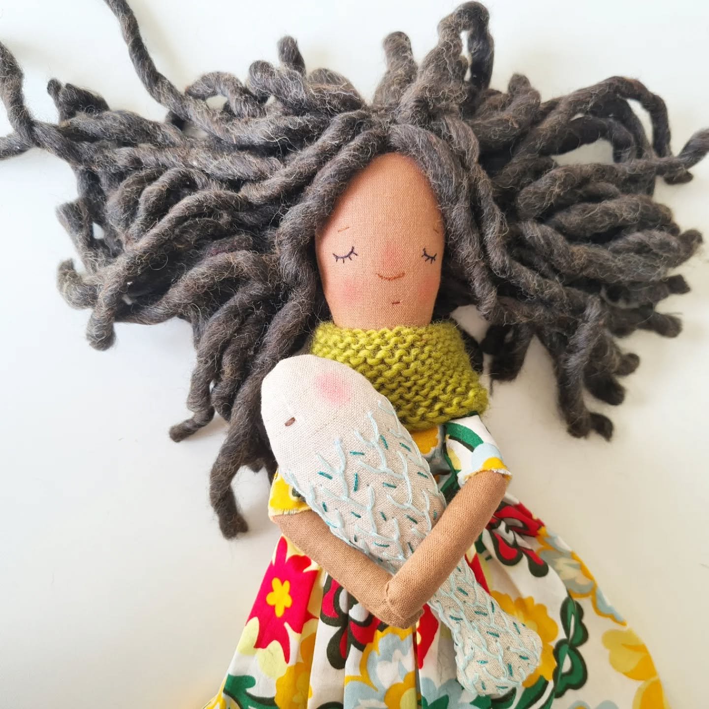 É uma boneca delicada, com muitos detalhes costurados manualmente